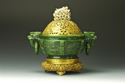 爐身為高級碧玉所製,是18 世紀早期新疆產玉,色嬌綠、溫潤,乃碧玉中最美之翡翠之格,為乾隆期造辦處之首選玉。高浮雕饕餮紋簡捷有力,雙瑞獸環耳炯炯有神,簡單古樸,附和清中早期造辦處的做法。