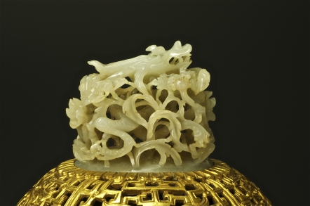 上蓋鎏金銅:簍空鑿刻夔龍紋飾。 崁ㄧ元朝白玉爐頂(乾隆帝最喜用前朝古物裝飾或題詩)。