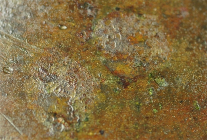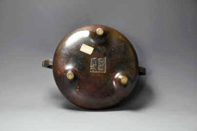 | 三足雙耳素銅爐,厚胎質重。平口,無肩,弧壁鼓腹。素雅紮實,皮色溫潤,皮殻氧化內斂,銅綠、紅斑腐蝕顯著深沈,有因年代所造成的重量減輕及老化現象,是明朝宣德當時代的產品,也是明朝宣德爐的代表作。 |