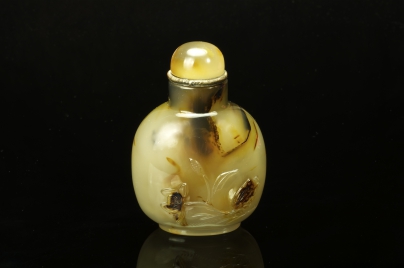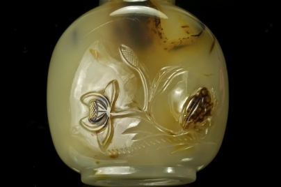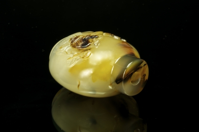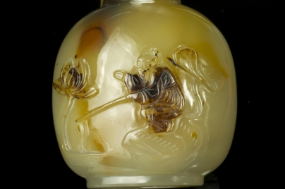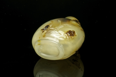 黄褐色玛瑙,椭圆底。利用黑影巧雕是苏州工最有艺术性的地方。前面利用黑影巧雕荷花及人物衣服、头发,背面黑影巧雕荷花及青蛙。使故事内容发挥淋漓尽致,主题明显,线条柔畅,是18世纪的作品。