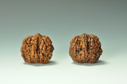 核桃一对,满雕葫芦及其藤、叶,寄寓万代福禄。就其皮壳氧化现象断其应为清末民初的产品。