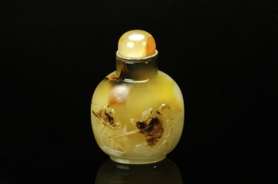 玛瑙巧雕鼻烟壶 荷花池垂钓