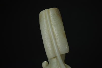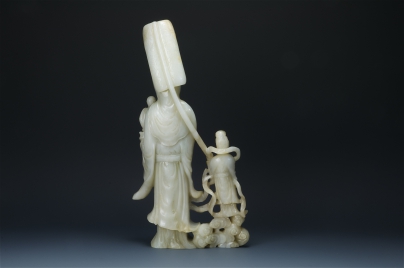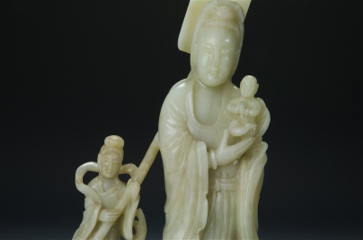 白玉雕一立像觀音雙手抱一童子,右邊仙女站立於雲紋上,手持一扇,扇後面陰刻螭龍紋。於表情、比例、雕法應屬元朝或明早期之手法。
