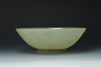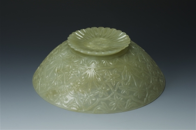 青白玉痕都斯坦紋飾碗,撇口,弧壁,平展菊花底(另件雕刻)。整體滿雕葉片與花片紋,腹下方有一條平行裝飾帶。