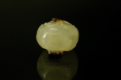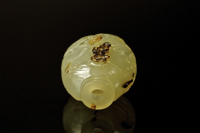 | 壺身為冰糖瑪瑙,平底。並利用影子於兩面各巧雕一隻瑞獸。此作法是蘇州最善長的巧雕影子瑪瑙,其山景、石頭的切工法也是獨特的蘇州地區特有工法。據判斷此壺應為18世紀的作品。 |