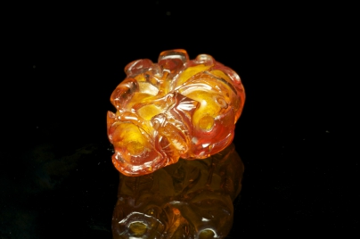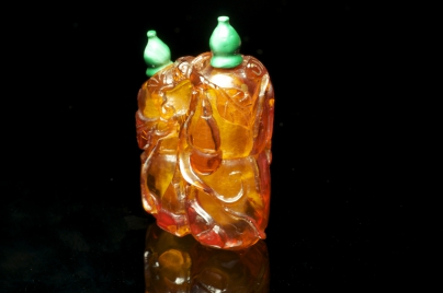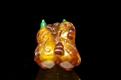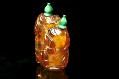 雕兩個葫蘆為主體的金珀塊料,周邊被葫蘆枝、葉及數個小葫蘆圍繞,工法細膩周嚴,稱福祿萬代。滿布年代痕積的小細紋,判斷其應為19世紀的作品。材料特殊,兩個葫蘆容器可裝不同兩種鼻煙,在當時高官貴族鼻煙圈內,可拿來炫耀。