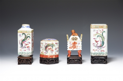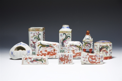 墨床,紙鎮,筆架,印泥盒,硯台,水盛,方瓶,花薰,爐,筆筒等十件文房組成,用酸枝木盒裝箱。每件器具皆畫以龍鳳紋飾,藍色料彩修飾。每件並附木座。