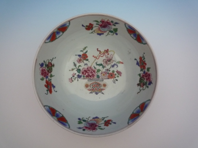碗面以霽藍為底色,釉上珍珠白粉彩,使得突出顯眼。碗內白底五彩花卉紋飾,色澤踏實穩重。胎土、畫工、紋飾都屬清中期的做法。