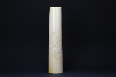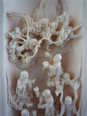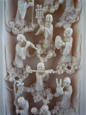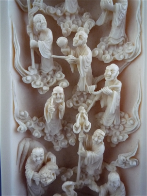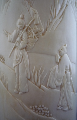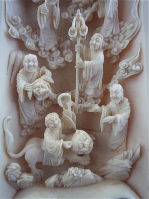 | 象牙內心雕十八羅漢,各站立於團雲上,各持不同法器,表情不同,雲端上一穿雲龍穿梭於雲海中。表面雕一翁一童子持鋤頭上山採藥。雕工精細,打底平整,是一件很好的文玩器具,應是清中晚期的產品。 |