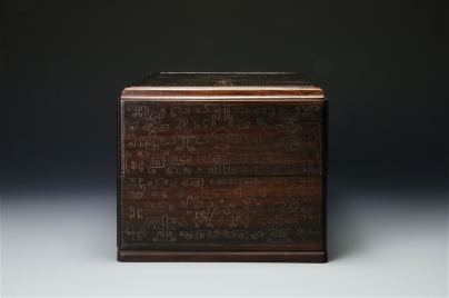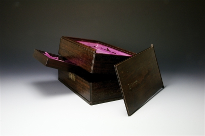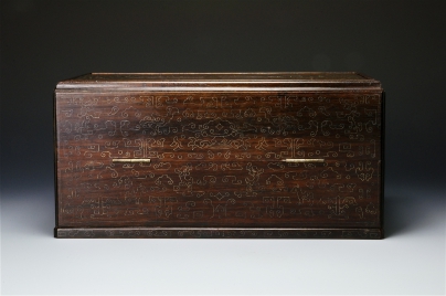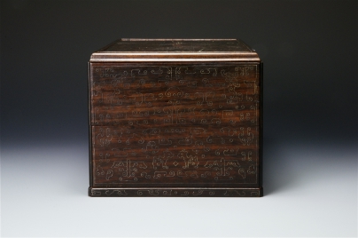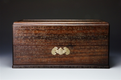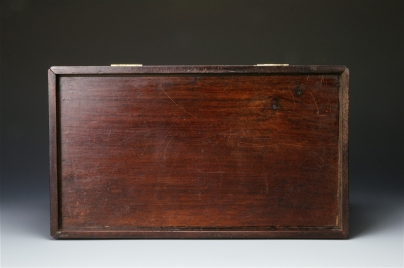 | 酸枝木通體崁銀線文玩組盒,上方一抽屜內有一櫃,盒設一鎖,櫃內有雙層,因此此盒有三櫃可使用。通體崁銀線以如意紋、花卉紋、動物紋搭配而成。此盒在清末時期,裝筆、墨、硯台、筆架、紙鎮-----等文玩用品。在民國時期更大量使用,作為文玩用具之產品包裝。 |
