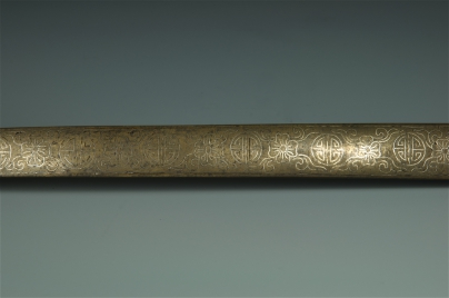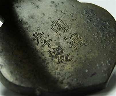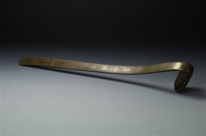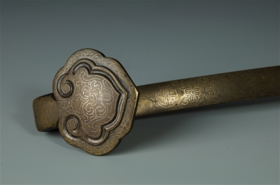 通體崁銀線銅如意,前面梅花紋、壽字紋,背面鑲銀五字“如意如吾意“。靈芝如意頭,背面鑲銀“宣德年製“四字款。