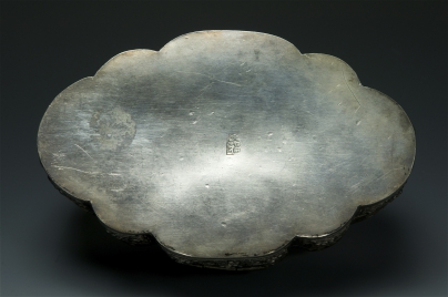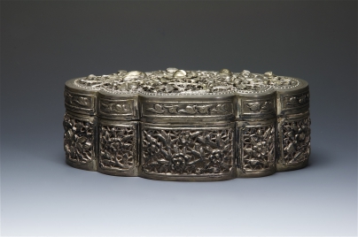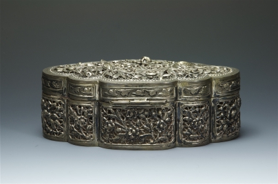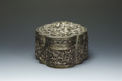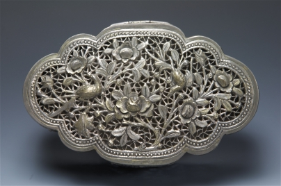 銀製花薰蓋盒,後置鉸鏈。上蓋簍雕喜上眉梢,下座簍雕梅花。雕工精細,是清中晚期產品。大福為商號。