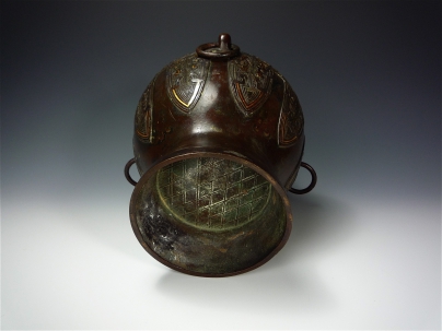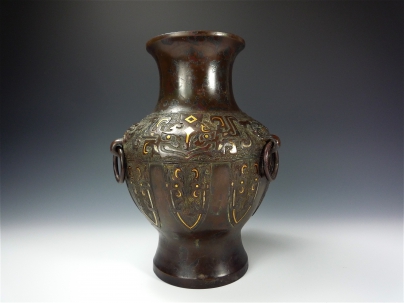 銅瓶小唇直口,長頸,鼓腹,腹下小撇、圈足,網狀底。肩部通體回紋、饕餮紋、金銀錯。腹下六片倒掛蕉葉內置回紋、饕餮紋、金銀錯。整體造型摹仿戰國鐘,古味十足,穩重華麗。