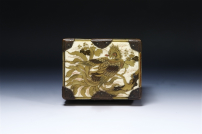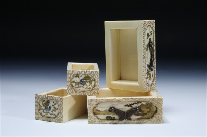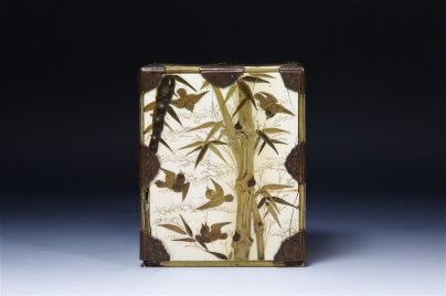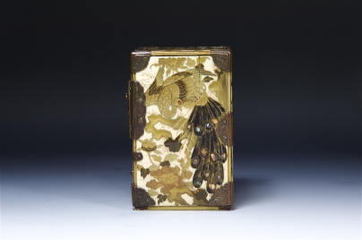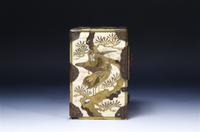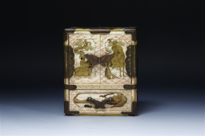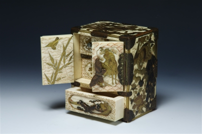 象牙珠寶櫃漆金,雙門四抽屜。雙門前面畫人物風景,門後面畫竹、燕,蝴蝶銅扣鎖。左側畫孔雀牡丹。右側畫松鶴延年。後面畫竹、燕。前抽屜畫山水,蝴蝶銅把手。內部三抽屜畫花卉, 內下抽屜蝴蝶銅把手,內上兩個小銅紐把手。四抽屜皆整塊象牙料挖成。