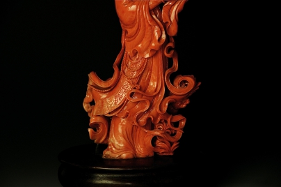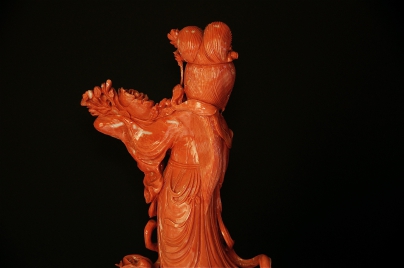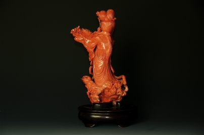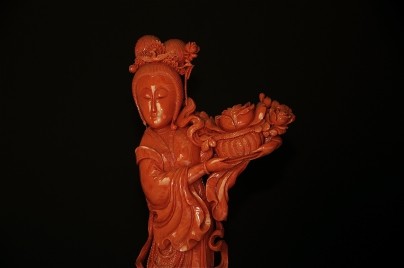 整枝珊瑚雕仙女站姿。鵝蛋臉,雙手捧花作灑花狀。衣帶飄逸精工,是70年代作品。