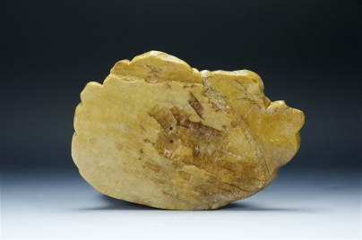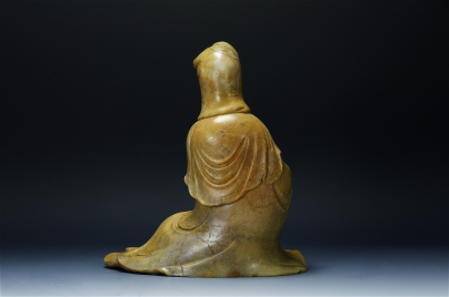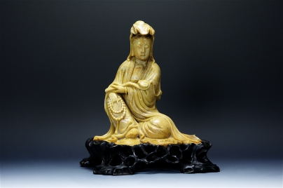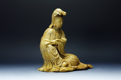 壽山石雕半架式坐姿觀音,右手佛珠左手如意靠在右腿上,慈祥莊嚴,體態悠雅,服飾雕法表現飄逸,是18世紀的觀音。