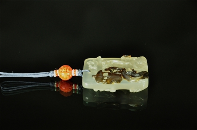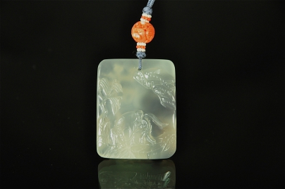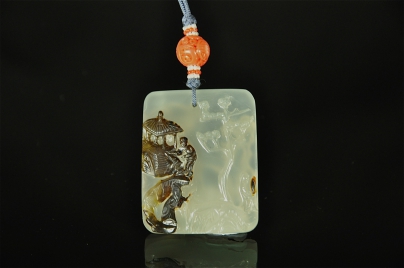 方型冰糖瑪瑙,正面利用黑色部份(影子)巧雕山水涼亭,意旨步步高升,背面雕老人牽驢,其山景石頭表現的方式皆為蘇州工。
